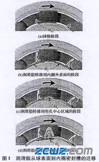 (1)附着到球上的润滑脂被保持架兜孔的内侧边缘抹除并附着到兜孔边缘,如图1a中的GWT所示。